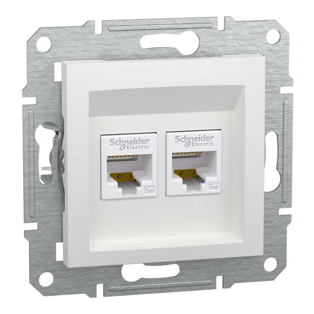 Комп'ютерна розетка RJ45 5e Schneider Electric Asfora EPH4470121 подвійна, механізм із супортом та накладкою білого кольору з двома портами RJ45 5e. Фіксація пристрою за допомогою монтажних лапок. Розміри розетки: (Ш) 71 мм x (В) 71 мм x (Г) 38 мм, глибина встановлення 9 мм. Пристрій може бути встановленний приховано. Поверхня розетки глянцева, що надає приміщенню елегантного та вишуканого вигляду. Ступінь захисту IP20. Клеми підключення IDC. Розетка виготовлена з ABS (акрилонітрил-бутадієн-стирол) матеріалу, що робить її максимально стійкою. Має знак якості CE. Оновлена фурнітура Asfora тепер має менші, компактніші накладки, профільовану фіксуючу рамку, а також широкі, профільовані монтажні лапки з поворотною пружиною, тим самим покращуючи якість та функціональність пристроїв. Продукція Asfora виготовлена з високоякісних матеріалів, які не жовтіють з часом. Витончений, елегантний дизайн ідеально гармонує з будь-яким інтер'єром.
