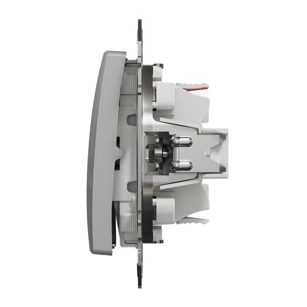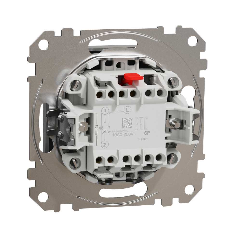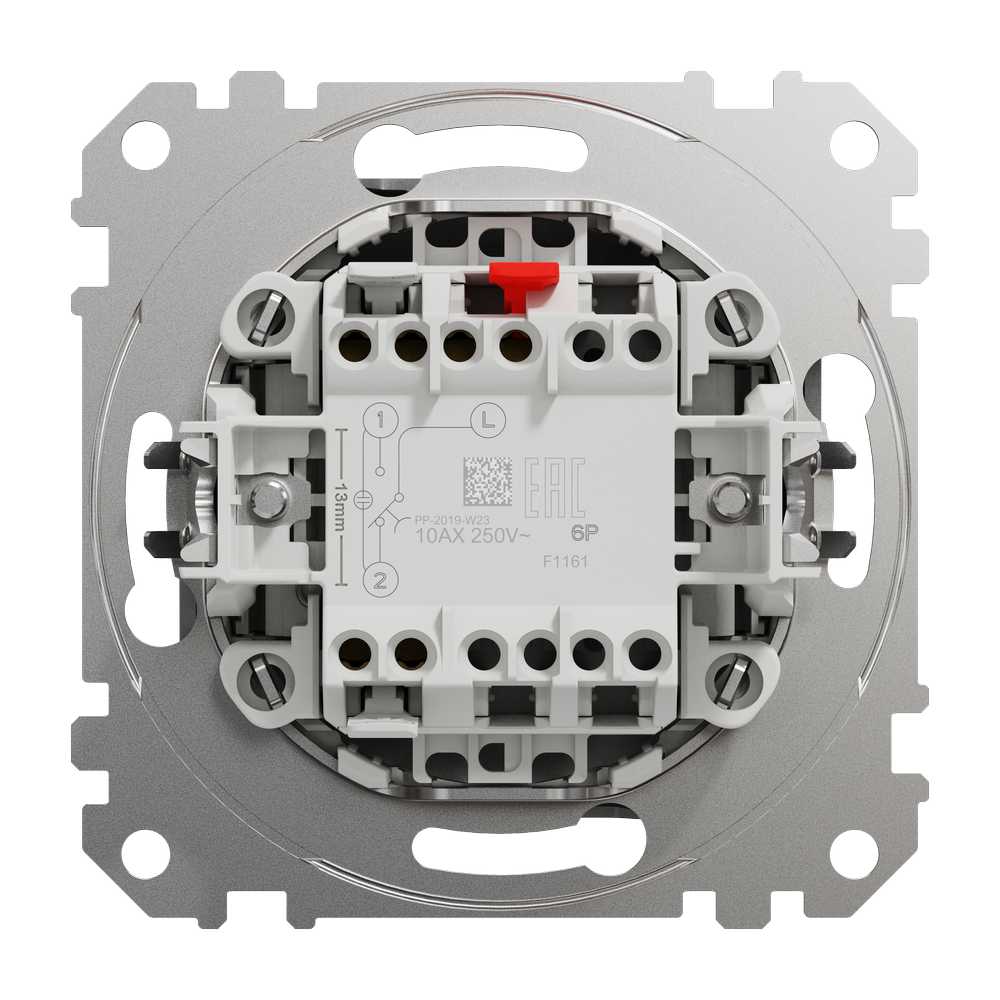 Одноклавішний кнопковий вимикач є елементом серії Sedna Design & Elements від Schneider Electric. Пристрій має фарбовану сріблясту поверхню кольору Алюміній та такі розміри: ширина 73 мм, висота 73 мм, глибина 37 мм, глибина виступу 24 мм. Довжина ізоляції, знятої з кабелю, становить 13 мм. Кнопка характеризується ступенем захисту IP20 і діапазоном потужності 2300 Вт. Для виготовлення вимикача використовувався термопластичний матеріал з підвищеною стійкістю до УФ-випромінювання. Виріб монтується впритул і має безгвинтові клеми. Пристрій можна використовувати як традиційний вимикач світла разом з імпульсним реле, кнопкою дзвінка або використовувати для перемикання інших пристроїв з максимальним споживанням струму до 10 А. Примітка: продукти Sedna Design & Elements несумісні з Sedna!