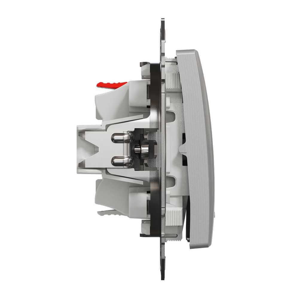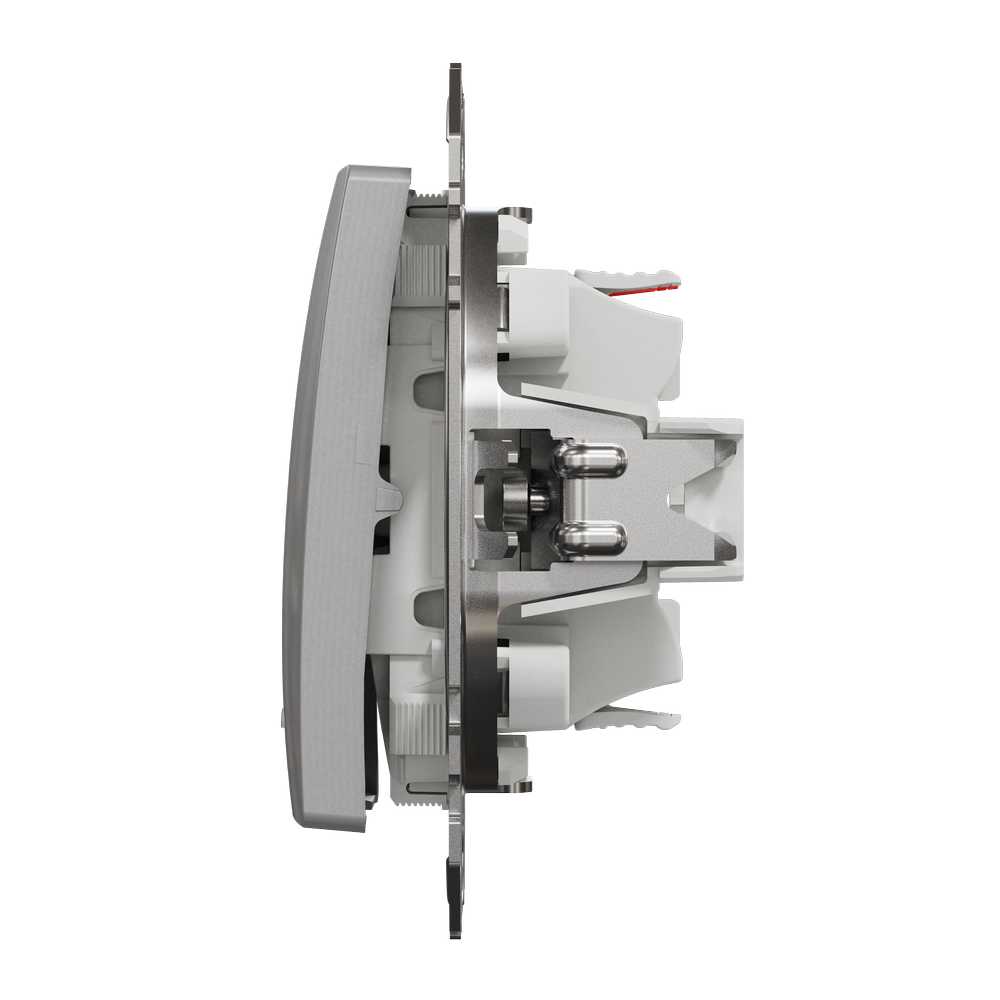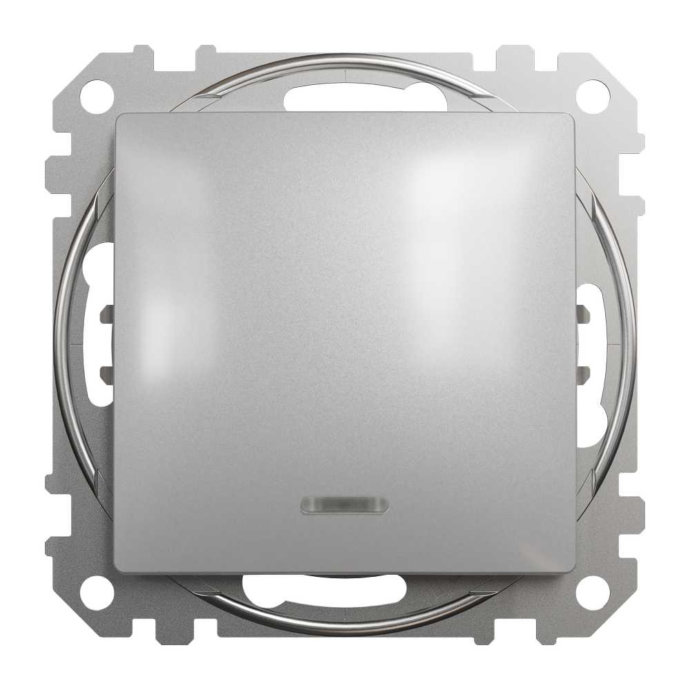 Одноклавішний перемикач (механізм з супортом) з підсвіткою синього кольору має глянцеву поверхню кольору Алюміній та такі розміри: ширина 73 мм, висота 73 мм, глибина 37 мм, глибина виступу 24 мм. Вага виробу 0,058 кг. Будучи виготовленим із термопластичного матеріалу ABS-UV, цей вимикач досить надійний і стійкий. Глянцева поверхня створює відчуття елегантності в кімнаті. Передбачено прихований монтаж. Спосіб кріплення вимикача - монтажні лапки, гвинти. Клеми безгвинтові Ступінь захисту IP20. Має знак якості CE. Повна відповідність стандарту IEC 60669-1. Закруглений профіль створює ілюзію, що вимикач знаходиться не врівень зі стіною, а наче перед нею, що додає дизайну легкості та елегантності. Примітка: продукти Sedna Design & Elements не сумісні з серією Sedna!