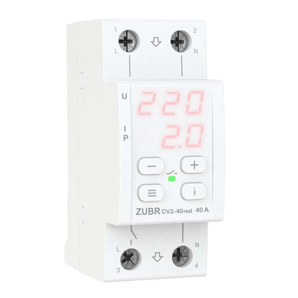 Реле напряжения с контролем по току ZUBR CV2 red с термозащитой предназначен для защиты однофазного оборудования от отклонений напряжения в сети, ограничения тока или полной мощности, с возможностью просмотра коэффициента мощности в электросети (cos φ).
